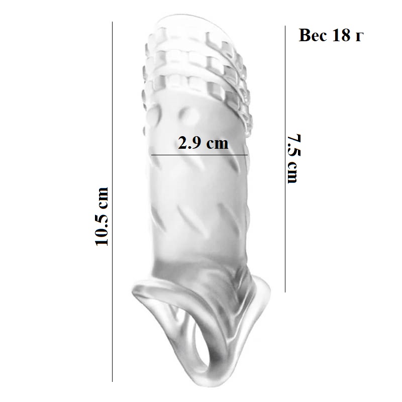 Насадка на член из очень крепкого и эластичного материала. Предназначена для длительного секса. Превратит Ваш пенис в настоящий отбойный молоток! Просто наденьте эту прозрачную оболочку и плотно сидящее кольцо для яичек - и Вы сможете долго ублажать Вашу партнершу удлиненным на 2см пенисом с бесчисленными пупырышками... Оболочка очень хорошо растягивается в длину (11см) и в диаметре (3см) Длина: 16 см., ширина: 2,5 см. Соответствует любому размеру пениса.